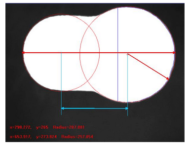 圖3:圖中兩個紅色的圓形是通過系統檢測程序,根據工件外形尺寸求出的擬合圓